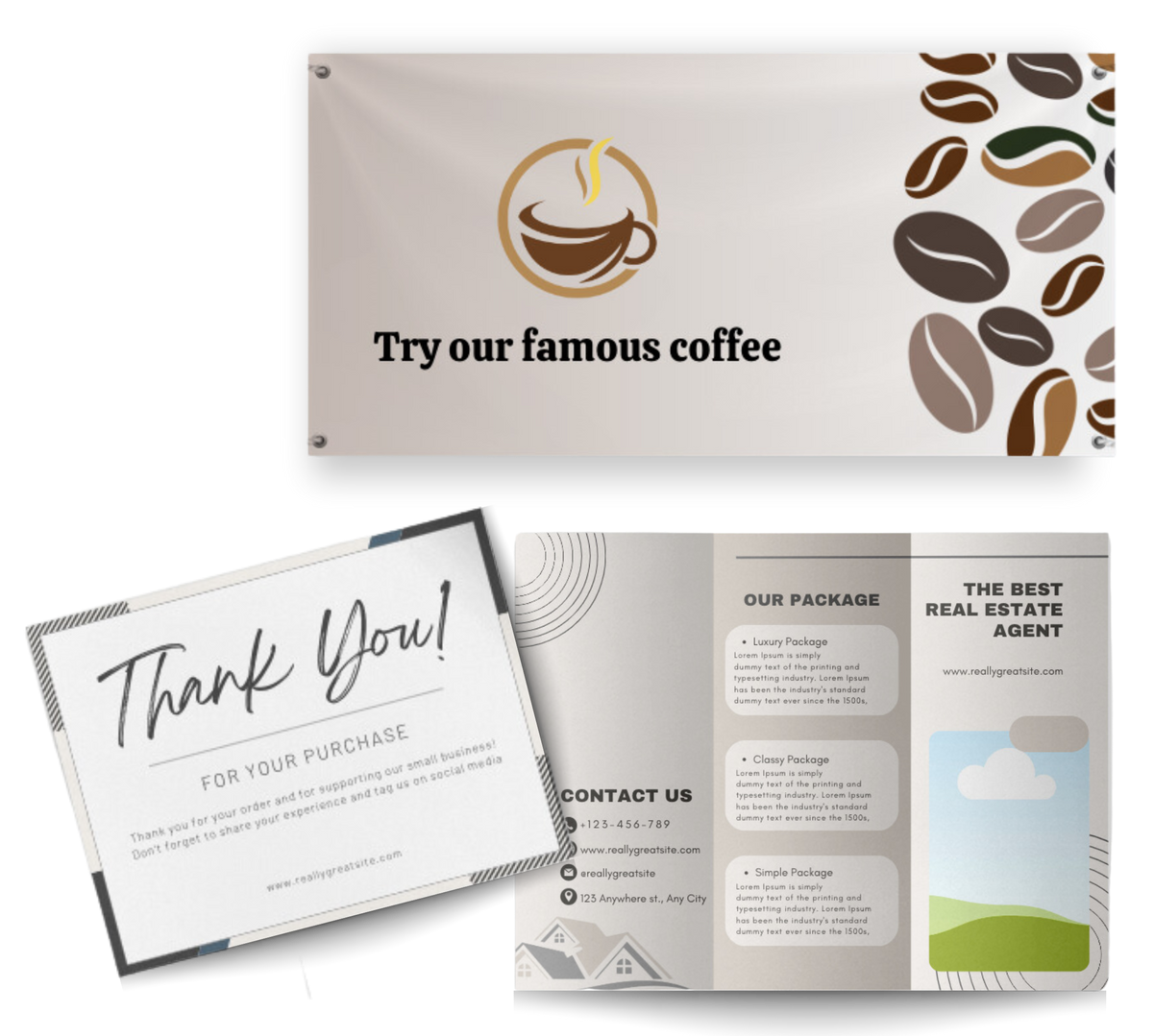 We design and produce any product you can imagine: Business cards, Banners, Yard Signs, Custom Promo Products and Apparel.